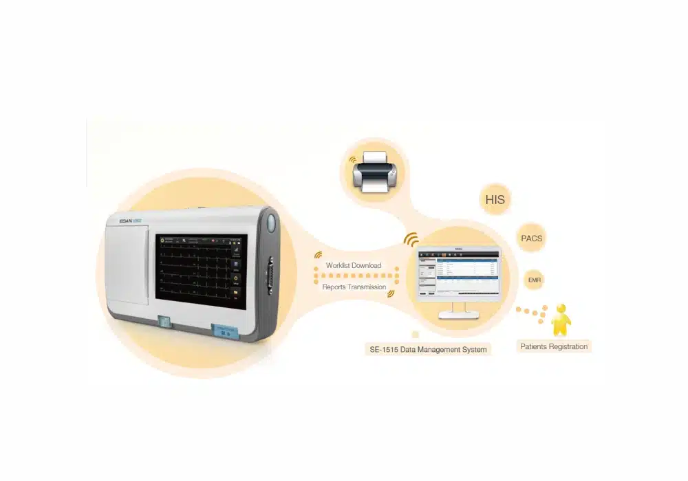 • Communication bidirectionnelle avec système de gestion :Grâce au LAN, au Wi-Fi intégré ou au modem GSM/GPRS, l’appareil peut recevoir des ordres et transmettre des ECG au SE-1515, pour analyse, modification, sauvegarde ou impression.