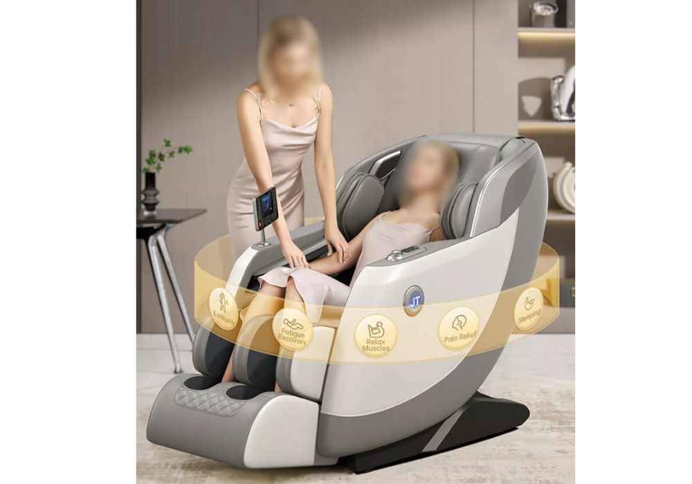 L’utilisateur peut ajuster l’intensité selon ses besoins. Le fauteuil intègre également un grand écran de commande, la musique Bluetooth, et un éclairage décoratif LED sur les accoudoirs pour créer une ambiance adaptée aux espaces de relaxation.